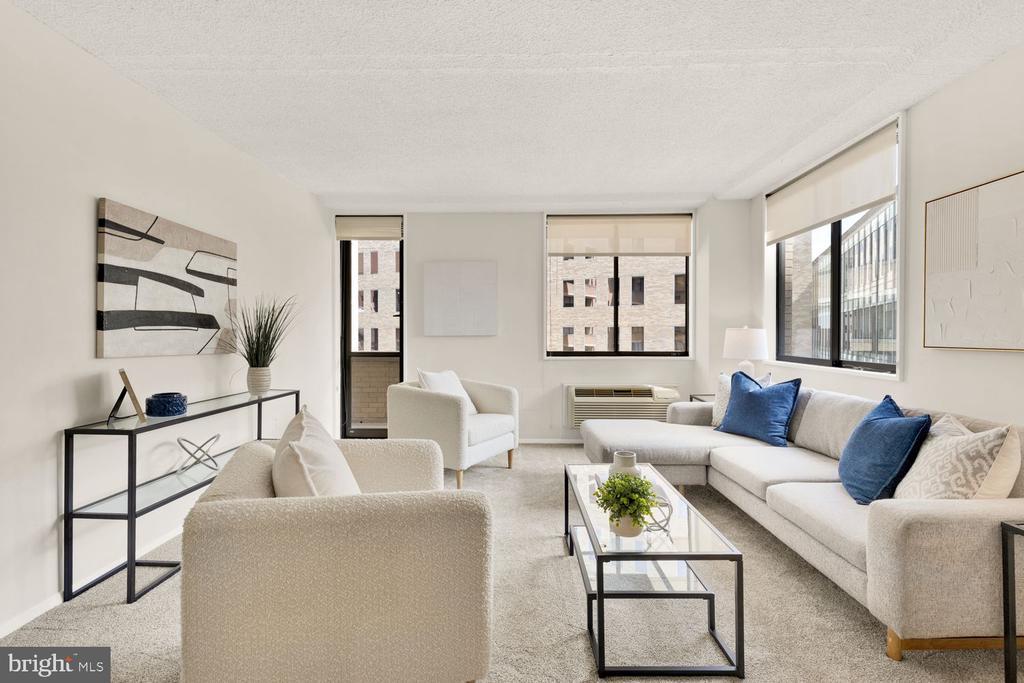 Welcome to this super spacious and bright 1 bedroom 1 bath condo located in the heart of Dupont Circle! This condo offers a perfect blend of modern comfort, space, and urban convenience. Upon entering, you are greeted by a foyer with a large double door coat closet. The kitchen with a window and matching bar counter opens into an inviting living + dining space with abundant natural light. The living space is generous and allows for flexible use and has a glass door to the balcony for enjoying your morning coffee, evening sunsets, or getting some fresh air.