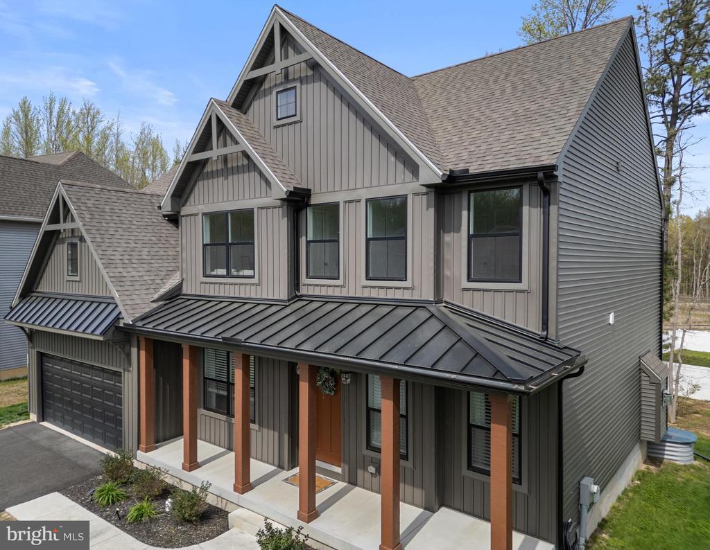 Welcome to 194 Cool Springs Road in North East, MD. This modern upscale home features many premium upgrades rarely found in other homes within this community. As an example, the architectural angles and the color scheme is a dark, rich tone that gives it a sleek and upscale vibe. The front exterior is a vertical board and batten siding with a metal roof accent over the warm wood-tone columns that add character and charm. The black vinyl windows elevate the home’s style, offering a modern, luxurious alternative to the traditional white look. Step through the custom 8-foot door into stunning modern space with sophistication, where soaring 9-foot ceilings create an airy, light-filled atmosphere. To the right, a stylish office with French doors offers privacy, while to the left, an inviting space awaits — perfect for a sitting room or formal dining area. The open-concept living, kitchen, and dining areas blend seamlessly, enhanced by walls of windows that fill the space with light and energy. The gourmet kitchen features upscale cabinetry, sleek hardware, quartz countertops, a large chef’s island, premium appliances — including a gas range with a high-end hood — and a walk-in pantry for effortless organization. The main floor boasts soaring 9' ceilings, elegant high pocket lighting throughout, a stylish half bath, and a convenient two-car garage.
