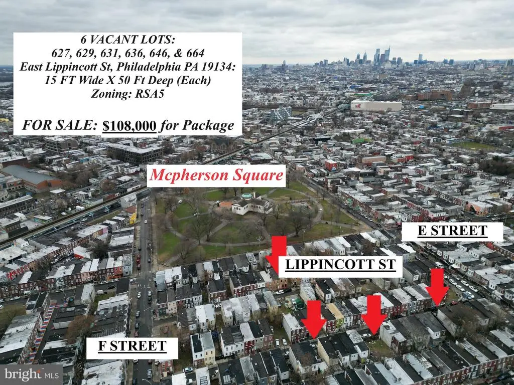6 Lot Package on 600 Block of East Lippincott in Kensington 627 Easy Lippincott St, Philadelphia PA 19134 (15 FTX50FT) RSA5 ZONING 629 Easy Lippincott St, Philadelphia PA 19134 (15 FTX50FT) RSA5 ZONING 631 Easy Lippincott St, Philadelphia PA 19134 (15 FTX50FT) RSA5 ZONING 636 Easy Lippincott St, Philadelphia PA 19134 (15 FTX50FT) RSA5 ZONING 646 Easy Lippincott St, Philadelphia PA 19134 (15 FTX50FT) RSA5 ZONING 664 Easy Lippincott St, Philadelphia PA 19134 (15 FTX50FT) RSA5 ZONING All lots on the same block - between E Street & F Street off of Allegheny Avenue in the heart of Kensington. Right by K&A. Development will be coming this way soon. This is a good buy & hold opportunity to get your hands on 6 building sites on the same block. Easy access to the El, McPherson Square, Kensington Ave, & Allegheny Ave. Any builder, or aggregator of land understands the added value of having parcels together on the same block. 6 Parcels together ultimately will reduce your building costs and efficiency - acquire the land now before the prices increase. Asking Price: $108,000 (MUST BUY ALL)