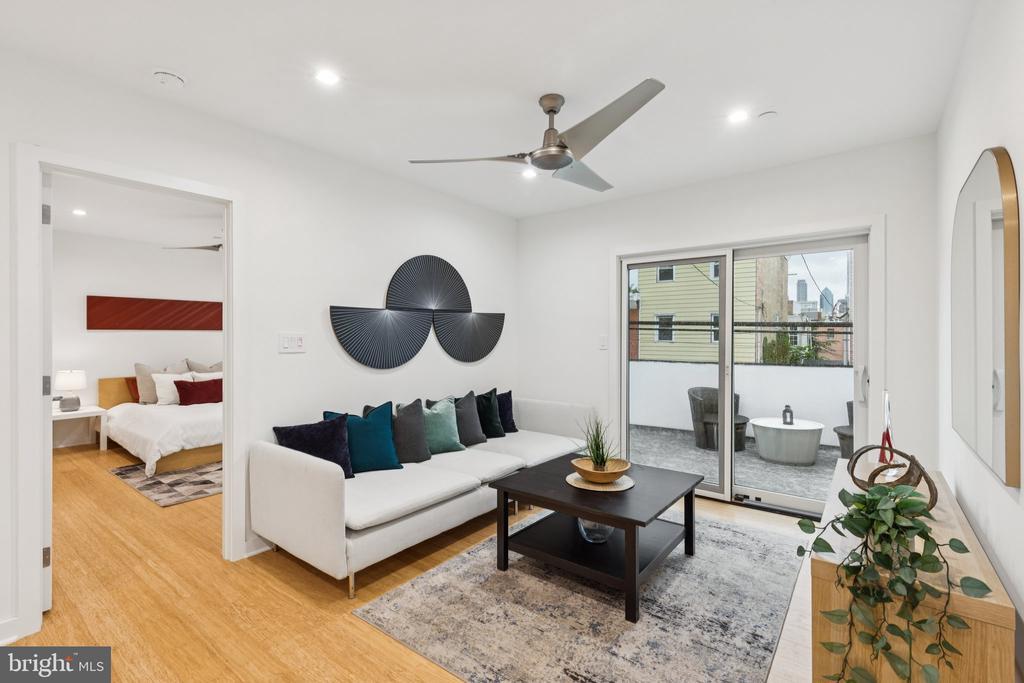 Just off the living room, a room-sized private balcony overlooks Wharton Street—ideal for morning coffee, casual outdoor meals, or hosting friends outdoors.