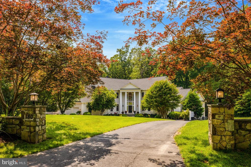 Welcome to this unique V-shaped residence, framed by four stately columns and a soaring artistic Palladian window. This distinguished home, offering 9 bedrooms and 8 baths and providing over 9,000 sq ft of living space, is located in one of the most desired and lovely neighborhoods on the east side of Great Falls; the proximity to the village center, Riverbend Country Club, and the national and regional parks can’t be beat. An elegant octagonal foyer sets the tone for the home’s refined and thoughtful design. The main level features beautifully refinished hardwood floors and flows seamlessly into a remodeled gourmet kitchen and a dramatic two-story family room, which is framed above by a striking gallery-style promenade. Expansive picture windows throughout flood the home with natural light and offer sweeping views of the surrounding woodlands. The main level also hosts the spacious owner’s suite—a true retreat—featuring a recently renovated bathroom with luxurious, spa-quality finishes. Upstairs, you’ll find four generously sized ensuite bedrooms, each offering comfort and privacy. The fully finished lower level adds even more versatility, with four additional bedrooms, a full kitchen, and ample space for guests, multi-generational living, or extended entertaining. Outdoors, a private path winds through the backyard, providing direct access to the scenic Potomac River—a rare and coveted amenity.