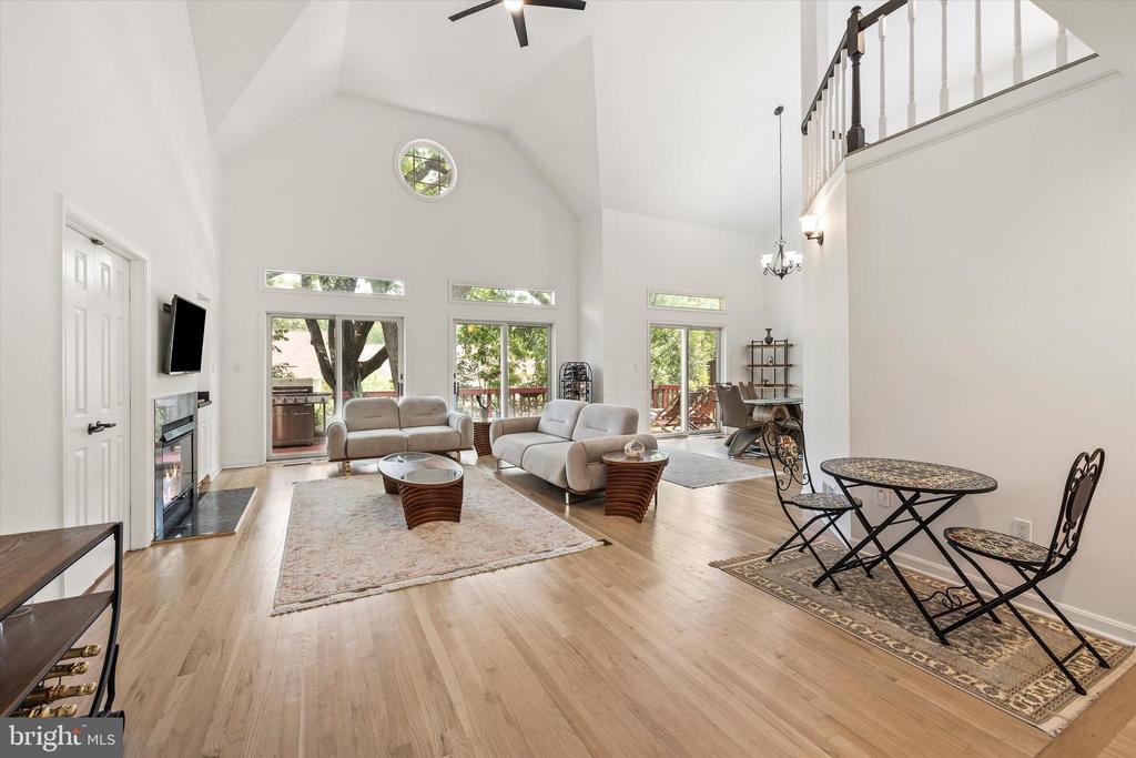 Step inside to find soaring ceilings, gleaming hardwood floors, fresh paint, sanded and stained floors, and brand-new carpet. The living room impresses with double-height ceilings, a cozy fireplace, and glass sliders leading to the expansive rear deck ideal for indoor/outdoor entertaining. The dining area shines with elegant lighting, flowing seamlessly into a chef’s kitchen complete with stainless steel appliances, granite countertops, stylish backsplash, and tall wood cabinetry.