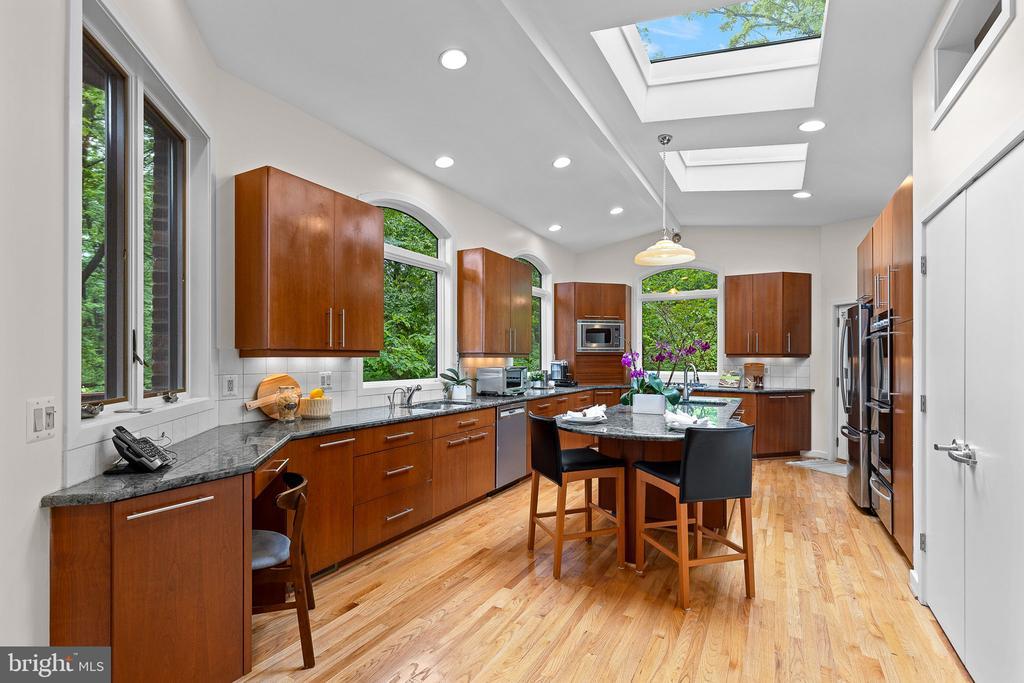 • Stunning updated kitchen boasting cathedral ceilings, skylights, and expansive windows overlooking the wooded lot. The kitchen features granite counters, large island, custom cabinetry, pantry, stainless-steel appliances.