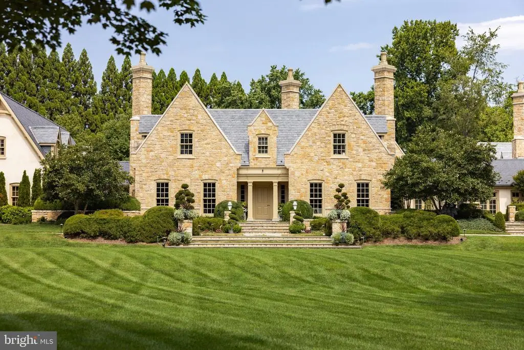 The residence was a collaboration between David Cooper of ACG Architects and BOWA Construction, with further enhancements by Hanlon Design Build. Spanning more than 20,000 square feet, the estate showcases exceptional craftsmanship, timeless style, and premier amenities. A pea stone driveway leads to a central flagstone motor court, where imported Cotswold limestone, a slate roof with metal seams, copper gutters, and freshly repainted woodwork set a tone of enduring grandeur. Classic symmetry, steep gables, and towering chimneys create a striking first impression, balanced by warmth. Every exterior window and door is framed in rich mahogany, underscoring the commitment to quality and authenticity.